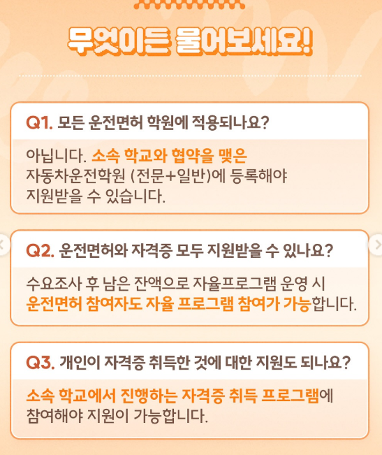 특히 수능 끝난 11~12월에 면허를 따려는 학생이 많기 때문에 미리 학원 상담 → 학교 공지 확인 → 영수증 준비로만 준비해도 지원금을 100% 받을 수 있습니다.