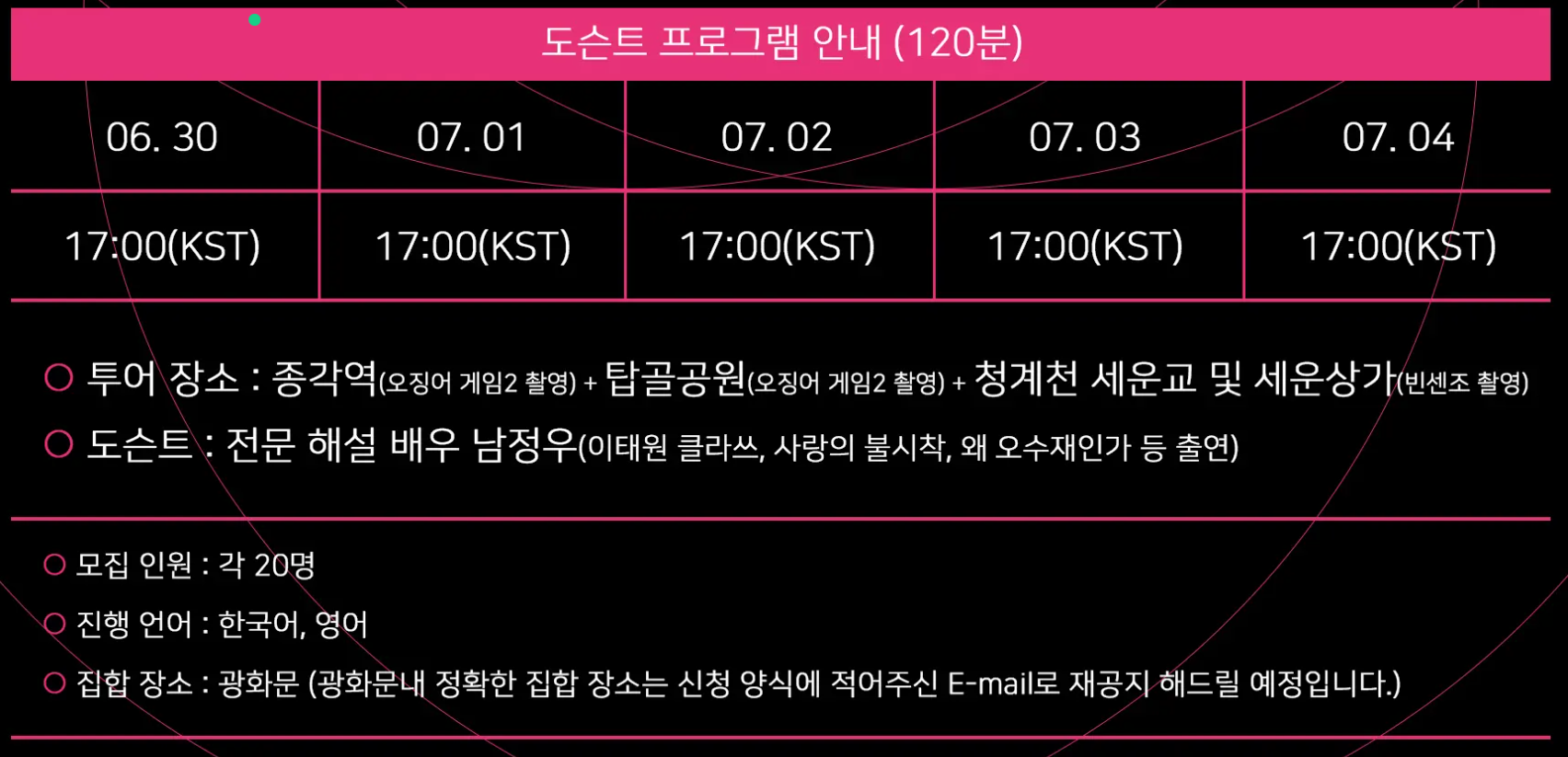 관광객들은 이번 행사를 통해 서울 도심 속 K-콘텐츠 촬영지인 ‘소울 스팟(Soul Spot)’을 방문하며 드라마 속 장면을 현실에서 직접 느껴볼 수 있습니다.