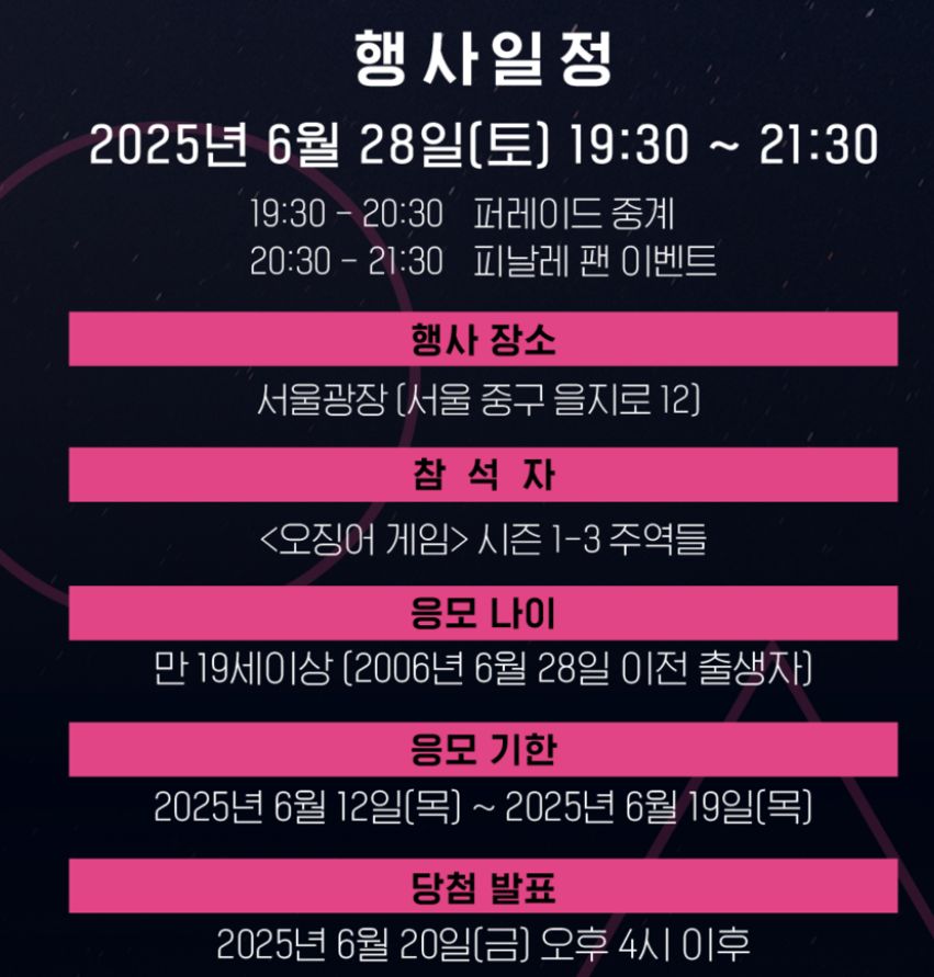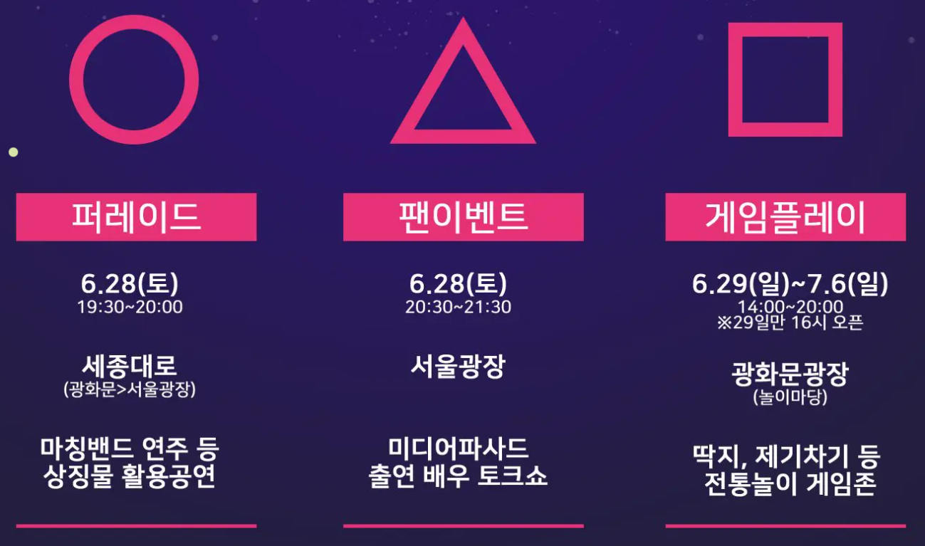 ✅ 6월 28일: 오징어게임 피날레, 배우 팬 이벤트, 거리 퍼레이드 - 서울광장·광화문광장