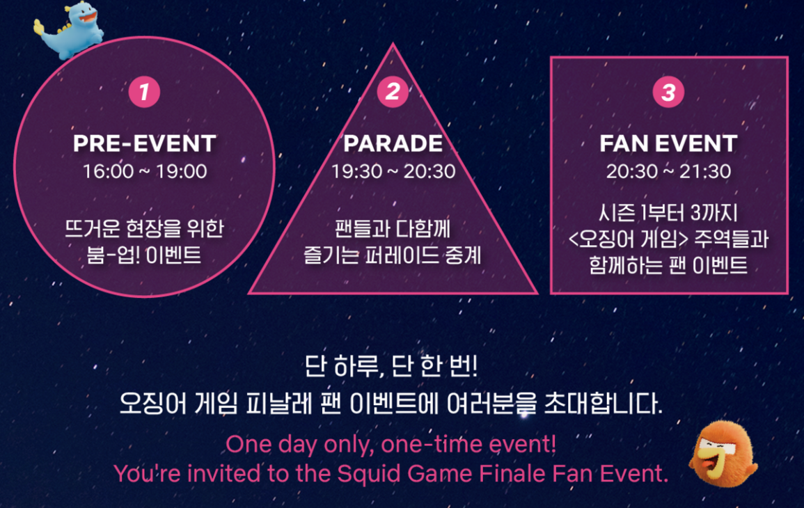 하이라이트는 ‘오징어 게임 시즌3 피날레’와 연계된 거리 퍼레이드와 팬 이벤트입니다.