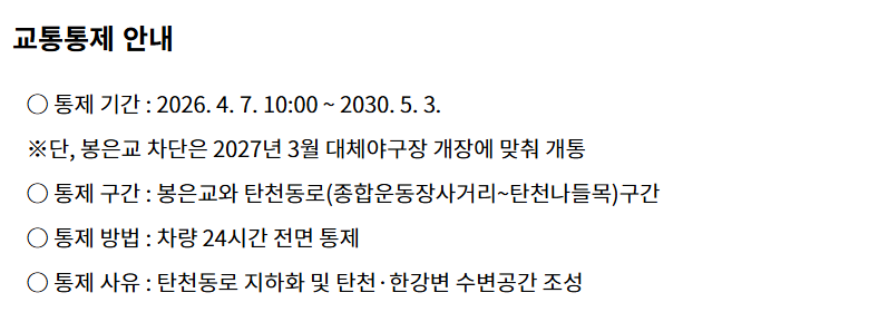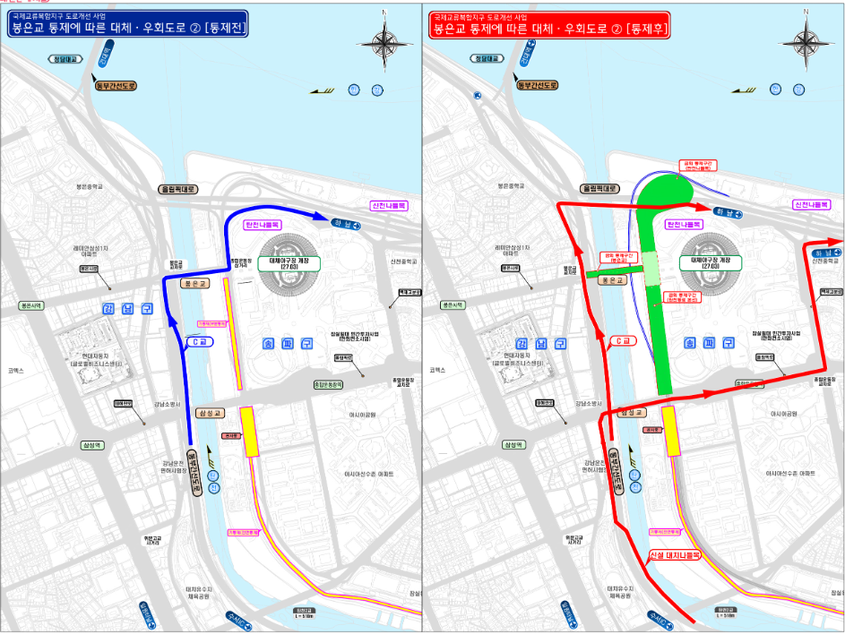 서울시 탄천·한강변 수변공간 조성 프로젝트의 일환으로 진행되는 탄천동로 지하화 공사로 인해, 봉은교와 종합운동장사거리~탄천나들목 구간의 통행이 제한됩니다.