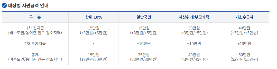 지급 금액 일반국민 15만 원 / 차상위·한부모 30만 원 / 기초수급자 40만 원 1인당 10만 원 추가 지급