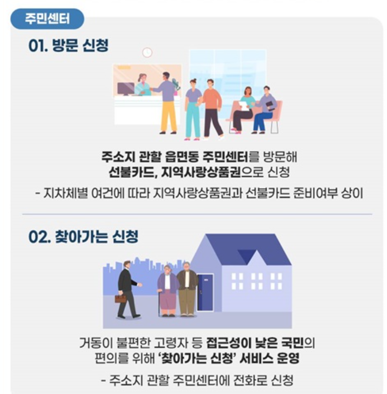• 찾아가는 서비스: 거동 불편 어르신·장애인은 주민센터 방문 접수 지원