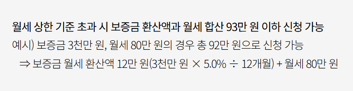 - 단, 월세가 초과되더라도 보증금 환산 + 월세 합산 금액이 93만 원 이하이면 신청 가능