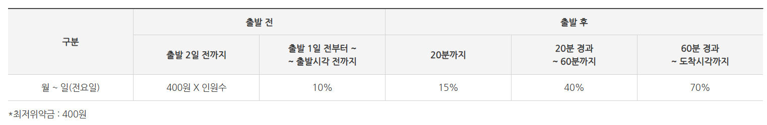 구입한 승차권을 환불하는 경우 환불시점에 따른 위약금이 발생합니다.