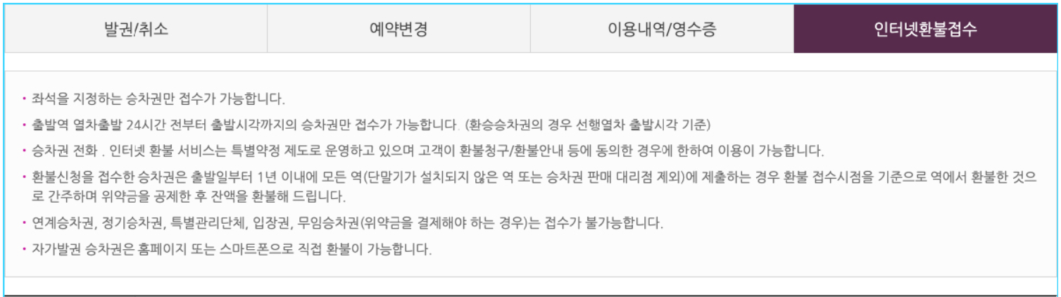 🚨 환불 접수한 승차권을 출발일보터 1년 이내 신청한 승차권(원권)을 소지하여 역 창구 방문 후 환불가능합니다.