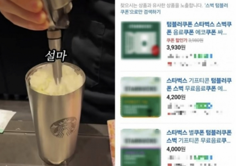 온라인에서 약 4000원에 판매되고 있는 '스타벅스 텀블러 쿠폰'을 검색해 미리 구매한 뒤 매장에서 사용하면 아무 음료나 추가금 없이 주문할 수 있다는 내용입니다.