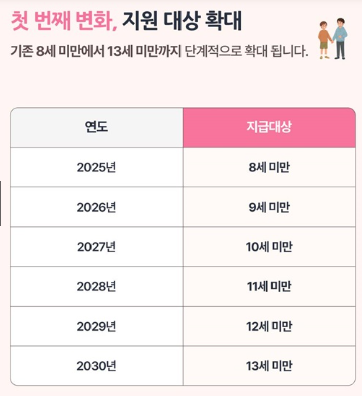 지급 대상 확대 8세 미만 → 13세 미만 (단계적 확대)