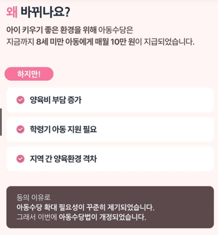 아동수당 확대 정책은 더 많은 가정의 양육 부담을 덜어드리기 위한 중요한 변화입니다. 변경된 내용을 꼭 확인하시고, 해당되는 혜택을 빠짐없이 챙기시기 바랍니다.