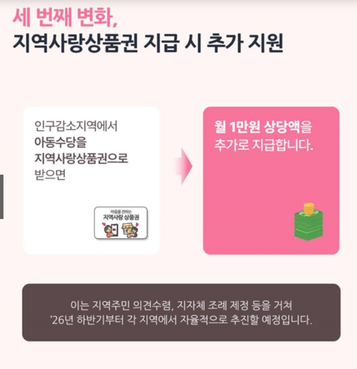 인구감소지역에서 아동수당을 지역사랑상품권으로 수령할 경우, 월 1만 원이 추가로 지원됩니다.