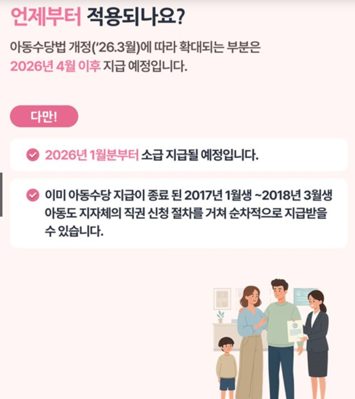 Q. 아동수당 확대는 언제부터 적용되나요? 2026년 1월분부터 소급 적용됩니다.
