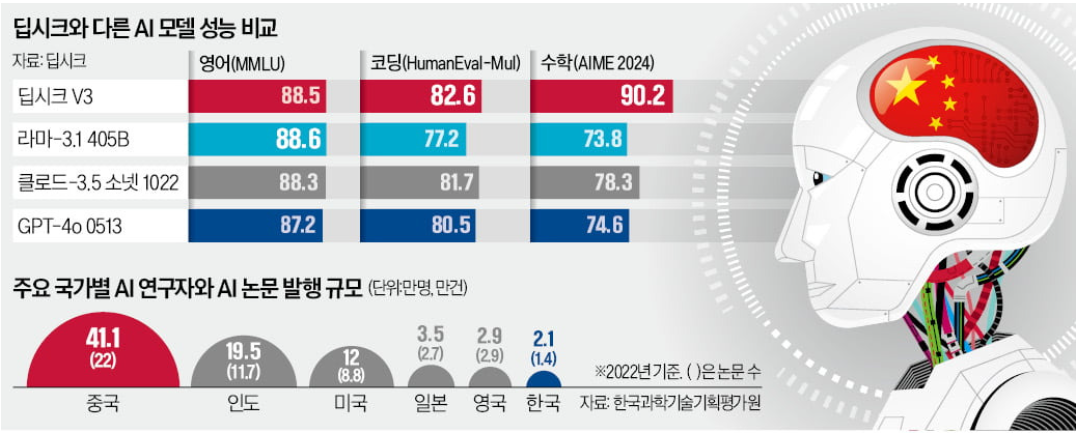 둘째, 성능 면에서도 딥시크는 쳇GPT와 대등한 수준의 결과를 내고 있습니다.