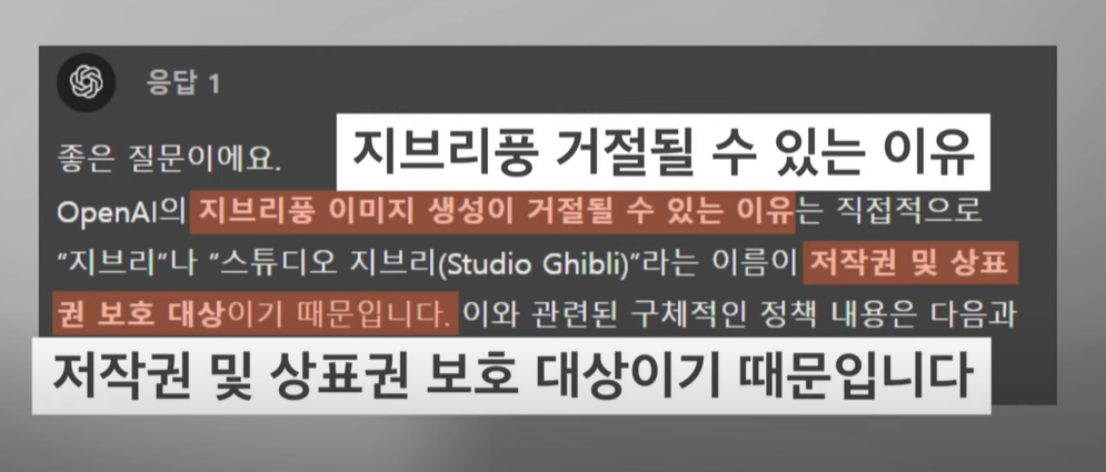 특히 ‘지브리’라는 키워드는 정책 상 저작권 보호 대상으로 명시되었으며, 사용자들이 생성 과정에서 이 단어를 사용하는 경우 오류 메시지가 출력되거나 기능이 작동하지 않도록 제한되었습니다.