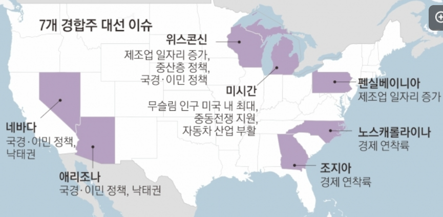 정치적 다양성: 경합주는 정치적 성향이 다양하여, 유권자들이 경제, 사회, 외교 등 다양한 이슈에 따라 선택을 달리할 수 있습니다. 이는 후보자들이 각 주의 특성에 맞춘 전략을 세우도록 만듭니다.