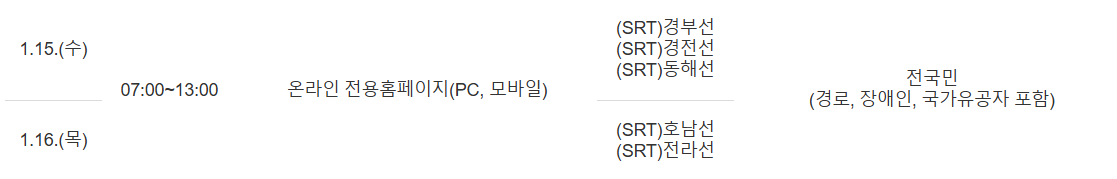 - 명절 승차권은 SR·코레일 간 온라인(홈페이지, 앱) 상호 발매를 하지 않습니다.