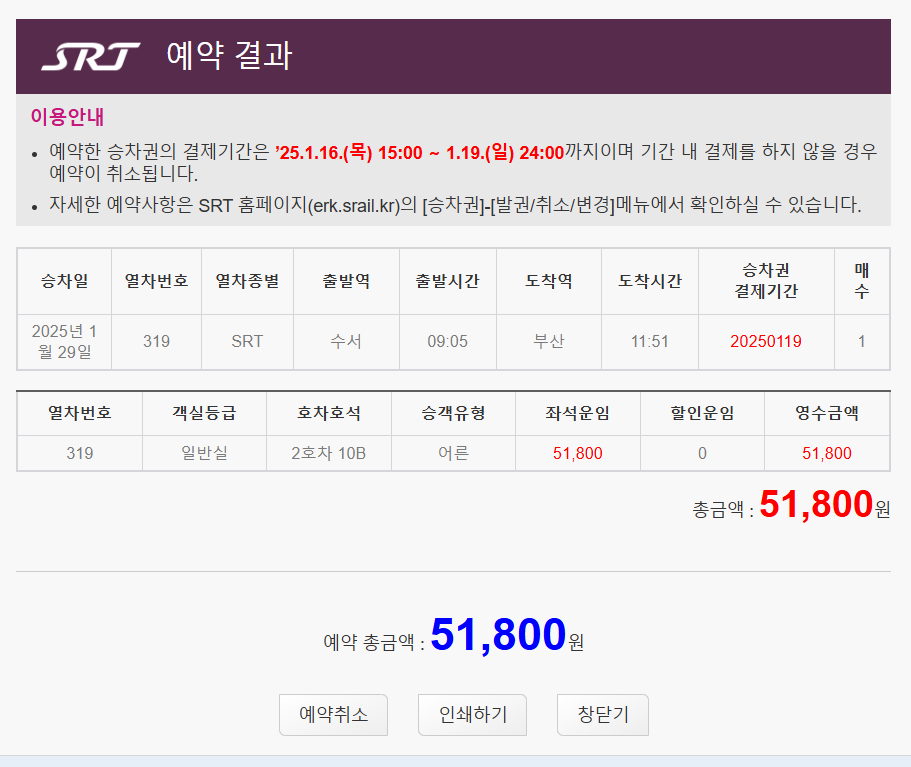 🚨 결제기간 내 결제를 완료하지 않을 경우 자동으로 취소되며, 전화접수 고객의 경우 역 창구에 기간 내 방문하여 결제해 주시기 바랍니다.