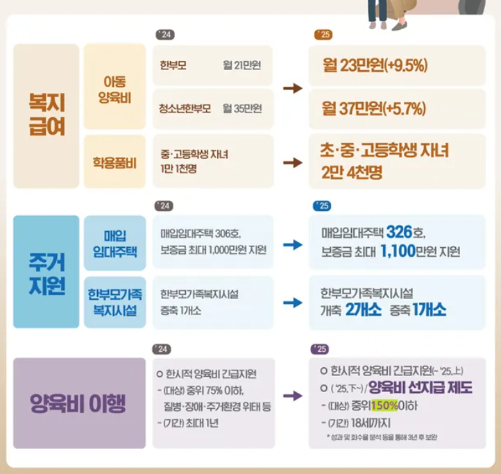 📌 항목: 양육비 지원 / 2024년: 월 20만원 / 2025년: 월 25만원으로 상향