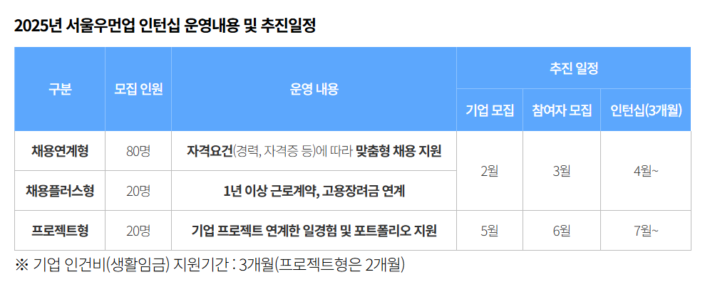 2025년도 서울 우먼업 인턴십 참여 기업 선발후 인턴십 3개월 운영후 정규직 또는 1년이상 고용연계 예정 기업