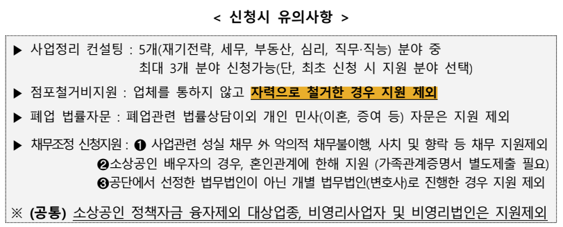 지원내용폐업 신고 등 행정처리, 법률·채무조정, 점포철거까지 패키지로 지원