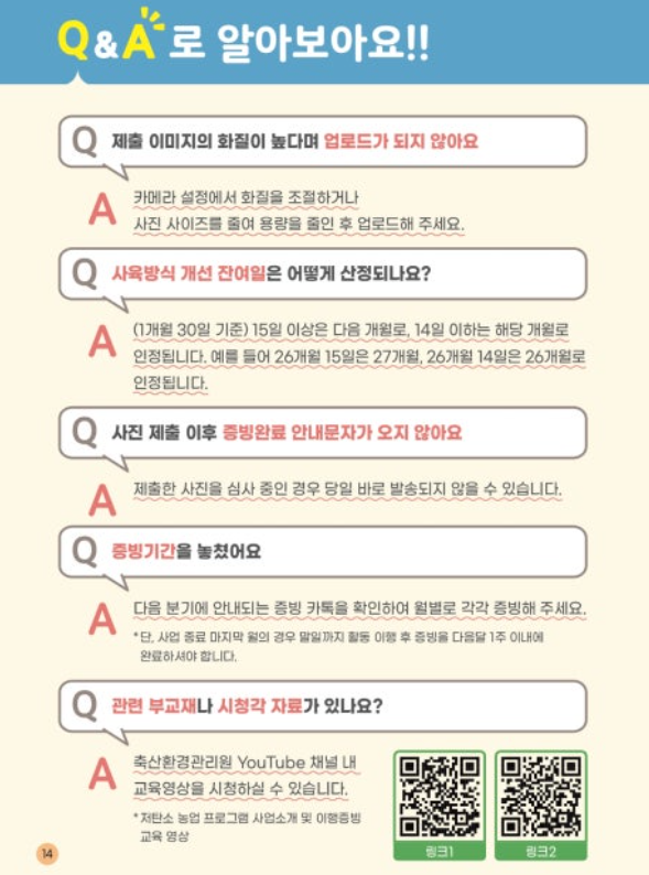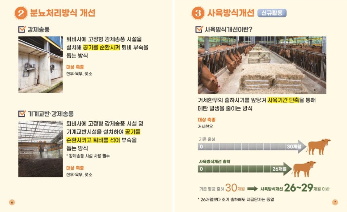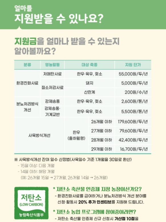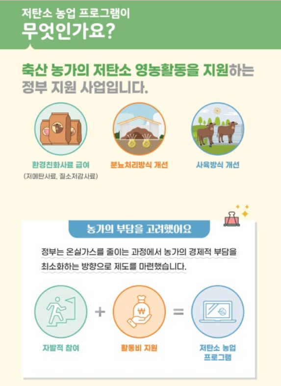온실가스를 줄이는 과정에서 농가의 경제적 부담을 최소화하기 위해 축산 농가의 저탄소 영농활동을 지원하는 정부 지원 사업입니다.
